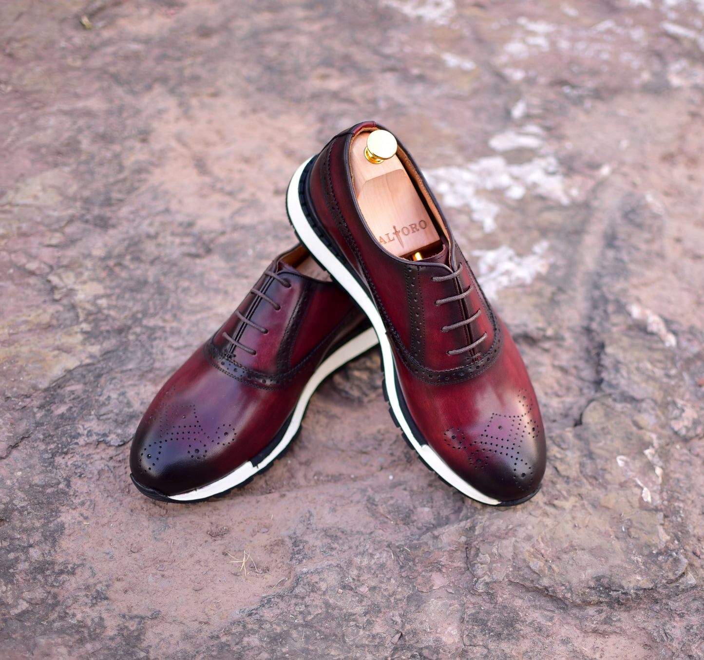 Add a refined touch to your wardrobe with these deep burgundy leather oxford dress sneakers for men, featuring classic brogue perforations and a polished finish. Blending traditional dress oxford elegance with modern sneaker comfort, they offer the perfect combination of style and versatility for any occasion.